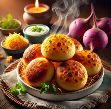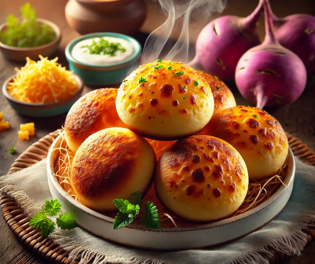 O cheiro invade a cozinha. Um aroma quente, acolhedor, que desperta a memória de manhãs preguiçosas e cafés servidos sem pressa. Mas este pão de queijo não é o de sempre. É mais leve, mais sutil, sem perder a essência: crocante por fora, macio por dentro, o salgado equilibrado pelo toque delicado do inhame.
