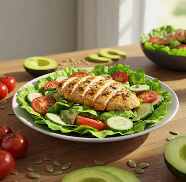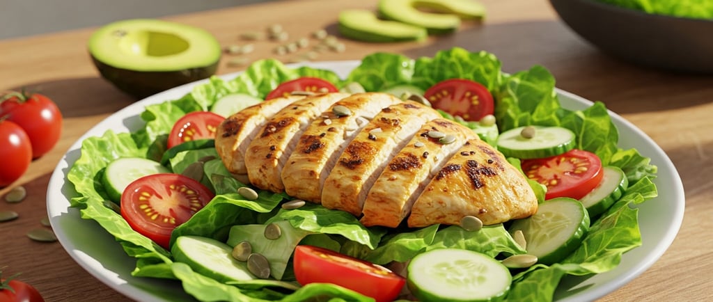Receita fitness salada verde com frango. a salada verde com frango é oásis de sabor e saúde. Frango grelhado, folhas frescas, pepino, tomate cereja e molho cítrico. Energia e bem-estar em cada garfada.